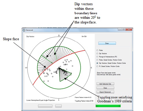 evaluate its potential to cause plane or toppling failure. It also calculates